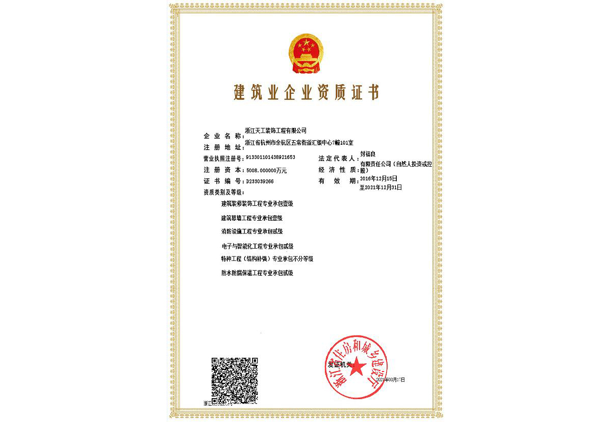浙江天工裝飾工程有限公司成立于1994年,是一家專注于建筑行業(yè)近三十年,余杭區(qū)內(nèi)規(guī)模最大、最專業(yè)的現(xiàn)代化專業(yè)承包企業(yè),連續(xù)十二年榮獲“余杭區(qū)建筑業(yè)十強(qiáng)企業(yè)”稱號。公司現(xiàn)任余杭區(qū)建筑裝飾行業(yè)協(xié)會會長單位、杭州市建筑裝飾行業(yè)協(xié)會副會長單位、浙江省建筑裝飾行業(yè)協(xié)會副會長單位、中國建筑裝飾協(xié)會理事單位。公司具備建筑裝修裝飾工程專業(yè)承包壹級、建筑幕墻工程專業(yè)承包壹級、建筑裝飾工程設(shè)計(jì)專項(xiàng)甲級、建筑幕墻工程設(shè)計(jì)專項(xiàng)甲級、展覽陳列工程設(shè)計(jì)施工一體化貳級、電子與智能化工程專業(yè)承包貳級、消防設(shè)施工程專業(yè)承包貳級、防水防腐保溫工程專業(yè)承包貳級,集建筑工程施工總承包、建筑機(jī)電安裝、城市及道路照明、鋼結(jié)構(gòu)、結(jié)構(gòu)補(bǔ)強(qiáng)、安防施工等多項(xiàng)資質(zhì)。主要從事大型公共建筑、星級酒店的室內(nèi)精裝修、建筑幕墻及建筑智能化工程的設(shè)計(jì)與施工。 天工裝飾始終把建筑裝飾當(dāng)作一項(xiàng) “美的事業(yè)”,在施工中嚴(yán)把質(zhì)量關(guān),不斷規(guī)范和提升工程技術(shù)標(biāo)準(zhǔn)。近年來,公司承建的浙商開元名都國際酒店I標(biāo)段裝飾工程、杭州藝尚雷迪森廣場酒店裝修工程、余杭區(qū)時(shí)代廣場5號樓(市民之家)室內(nèi)裝飾工程、永安之星室內(nèi)裝飾工程、青山湖科技城創(chuàng)業(yè)廣場裝修工程、杭州未來科技城醫(yī)院室內(nèi)裝飾工程、杭州師范大學(xué)附屬實(shí)驗(yàn)學(xué)校裝修工程、杭州老板電器股份有限公司辦公樓裝飾工程、深川控股集團(tuán)綜合樓幕墻工程、浙江省科技信息研究院幕墻工程、北航杭州創(chuàng)新研究院(余杭)內(nèi)裝及智能化提升改造項(xiàng)目(研究生院)工程、臨平新城人才服務(wù)中心設(shè)計(jì)釆購施工(EPC)工程總承包項(xiàng)目、浙江大學(xué)先進(jìn)電氣裝備創(chuàng)新中心室內(nèi)外裝飾及改造項(xiàng)目設(shè)計(jì)采購施工(EPC)工程總承包項(xiàng)目等,先后獲得“中國建筑工程裝飾獎(jiǎng)”、“全國建筑裝飾科技創(chuàng)新獎(jiǎng)”、浙江省建設(shè)工程“錢江杯”優(yōu)質(zhì)工程獎(jiǎng)、杭州市建設(shè)工程“西湖杯”優(yōu)質(zhì)工程獎(jiǎng)、嘉興市建設(shè)工程“南湖杯”優(yōu)質(zhì)工程獎(jiǎng)、“浙江省優(yōu)秀建筑裝飾工程獎(jiǎng)”、“浙江省優(yōu)質(zhì)安裝質(zhì)量獎(jiǎng)”等榮譽(yù)。 天工裝飾恪守“誠實(shí)守信、文明經(jīng)營”,近年來公司得到了客戶的信賴也獲得了業(yè)界的好評,先后被評為“國家級守合同重信用單位”、“全國建筑裝飾行業(yè)AAA級信用企業(yè)”、“全國百家科技創(chuàng)新型企業(yè)”、“浙江省AAA級守合同重信用單位”、“人民銀行信用等級AAA級企業(yè)”、“浙江省信用管理示范企業(yè)”、“浙江省誠信企業(yè)”、“浙江省建筑裝飾行業(yè)強(qiáng)優(yōu)企業(yè)”、“杭州市建筑業(yè)優(yōu)秀企業(yè)”、“余杭區(qū)建筑業(yè)十強(qiáng)企業(yè)”、 “余杭區(qū)人民政府質(zhì)量獎(jiǎng)”等榮譽(yù)。